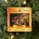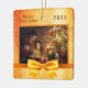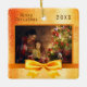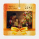 Un glamour rustique faux or à l'apparence métallique arrière - plan et un élégant faux arc et ruban d'or. Le texte : Joyeux Noël avec une police de style brun, lettres. Modèle pour votre propre photo de famille dans un cadre mince. Modèle pendant un an. Parfait comme cadeau ou comme gardien pour votre famille.