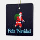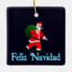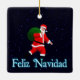 Crois-tu en Père Noël ? Image d'un Père Noël rayé, portant un sac vert de cadeaux ; superposée sur un arrière - plan étoilé. Le texte espagnol "Feliz Navidad" apparaît en bleu et blanc éclatant.