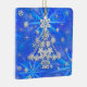 Ajoutez cet ornement ovale couleur de Noël non traditionnel à votre arbre ou en cadeau. Il montre une photo d'un ornement d'arbre de Noël blanc avec des flocons de neige d'art numérique qui l'entourent sur un modèle d'étoile fractale bleue.