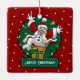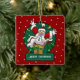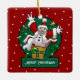 A funny snowman cartoon on a ceramic ornament for your Christmas tree. Use "Personalize this template" to change the "Merry Christmas!" text and create a unique, customized item; text changes are reflected on both sides. It's maximum Christmas with this excited snowman dressed up as Santa Claus, jumping out of a Christmas present like a jack-in-the-box. The surprise gift is wrapped in gold paisley wrapping paper and a green ribbon with white snowflakes.