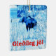 Image bleue et blanche d'un orignal de vache en milieu urbain en hiver. Le texte islandais "Gleðileg jól" (Joyeux Noël) apparaît en rouge. Les orignaux sont des résidents de nombreuses collectivités de l'Alaska qui vivent toute l'année. Ici à Anchorage il y a environ 1500 animaux, ainsi que des loups, des ours bruns et d'autres animaux sauvages.Ils sont généralement bien élevés. Ils traversent souvent les rues aux passages piétons après avoir attendu un signal de marche.