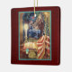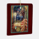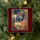 Patriotic Christmas Ornament with a view of the Nativity scene in a stained-glass Church window and the American Flag draped over the Bible down in front of the window. God Bless America!