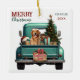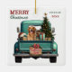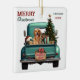 Un pick-up bleu turquoise porte un arbre de Noël décoré et des colis cadeaux sur ce joli ornement de Noël en verre. En regardant de la hayon arrière est un beau chien Golden Retriever. Un panneau en bois rustique sur le pare-chocs arrière dit "Cheer de Noël". Le texte stylisé rouge et vert en haut à gauche dit "MERRY CHRISTMAS", avec votre nom (ou celui de votre chien) et l'année à droite. Les deux camps ont la même image.