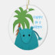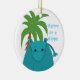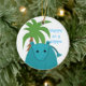 Un joli hippo bleu devant un grand palmier avec de grandes frondes et un tronc marron. Le dicton Happy as a Hippo peut être changé comme souhaité.