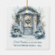 Un ornement de Noël en céramique carré avec une belle aquarelle illustration d'une porte d'entrée décorée pour les vacances. L'entrée est ornée d'une couronne festive, d'arbres déneigés et d'une scène d'hiver paisible, symbolisant la chaleur et la célébration dans une nouvelle maison. Sous l'oeuvre, le texte personnalisable dit "Premier Noël dans notre nouvelle maison" et "NOM FAMILLE - 20xx".Vous pouvez le customiser avec votre texte. Ce ornement fait un souvenir attentionné pour les familles qui célèbrent leur premier Noël dans une nouvelle maison.
