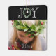 La typographie festive "Joy" avec fausse couronne d'eucalyptus pour la lettre "O". Ajoutez votre photo personnelle pour compléter ce joli ornement d'arbre. Arrière - plan noir élégant. Le motif sur le devant est porté à l'arrière de cette carte. Ajoutez l'année à la personnaliser.