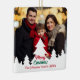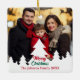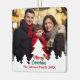 Cette photo de famille chic et moderne à double face ornement de Noël comprend votre photo de vacances annuelle encadrée par une bordure inférieure de silhouette d'arbres blancs de Noël. Personnalisez avec un script rouge et vert pour un beau cadeau de Noël de photographie minimaliste avec une 2ème photo sur le dos.