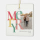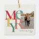 Ces ornements de Noël de 2,75 po x 2,75 po ont un espace réservé pour votre photo, nom et année préférés. Les lettres dans le mot, Joyeux sont grandes et dans différentes couleurs de rouge, vert et jaune sur un arrière - plan d'ivoire. Fait de porcelaine blanche, impression couleur plein fond, impression sur les deux côtés.