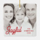 Christmas photo ornament featuring your custom family photo and red text “Joyful” in a festive, retro style font with customizable name and year to the right. Double sided printing with space for two photos.
