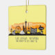 L'ornement en céramique présente la silhouette de la ligne d'horizon de la ville de Las Vegas Nevada avec l'éclat d'aquarelle du coucher du soleil sur les coordonnées jaune pâle de l'arrière - plan et latitude & longitude. Personnalisez avec le nom ou le message sur le dos.