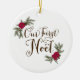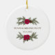 Commémorez votre premier Noël comme un ménage marié avec cet ornement comportant des branches et des poinsettias de pin et l'expression "notre premier noel". Le dos est personnalisé avec vos noms et date de mariage. Fait un grand cadeau de Noël pour un couple de nouveaux mariés !