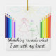 La partie antérieure montre une protection de croquis et un crayon avec les mots, "juste moi et mon cahier de croquis" imprimés cursif dans le noir. Le postérieur des produits montre les crayons colorés colorés - six de chaque côté - avec un croquis simple au milieu. Le dessin est d'une petite fille dans une robe offrant un bouquet de fleur à un chat. Quelques nuages sont dessinés ci-dessus. Sous sont les mots, aussi dans noir et cursif, la "esquisse indique ce que je vois avec mon coeur." Perfectionnez pour ceux qui gribouillent ou esquissent.