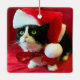 Éclairez votre arbre de Noël avec cet adorable ornement de Noël Peaches the Tuxedo Cat. Le design comprend des pêches portant un chapeau de Noël et une cravate de ruban rouge sur un arrière - plan de velours. L'ornement parfait pour l'amoureux des chats tuxedo à Noël. Le droit d'auteur apprend le chat Tuxedo