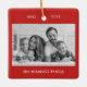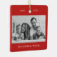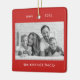 Ces ornements de Noël simples et minimalistes présentent votre photo personnelle préférée sur le devant ainsi que votre nom et l'année en blanc de machine à écrire look texte sur un arrière - plan rouge festif. L'arrière contient une autre de vos photos, éclairée par une superposition, afin que vous puissiez ajouter du texte ou des noms supplémentaires directement au-dessus.