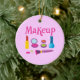 Cette illustration de maquillage brillante et colorée présente un assortiment de très beaux cosmétiques comme le rouge à lèvres, le vernis à ongles bleu, l'ombre verte orange et citron vert et le rougissement rose chaud et une jolie brosse violette! Ce maquillage de cosmétique est le cadeau idéal pour un cosmétologue, un maquilleur, un étudiant en école de beauté ou toute personne qui aime les couleurs néons brillantes et rétro des années 80 et l'art original amusant!