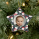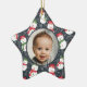 Baby's first Christmas photo ornament with a fun pattern with cute white mellow smiling snowmen in traditional candy cane red and kelly green hats and scarfs set on dark indigo blue background with line drawn flowers and holly. The photo and "Brandon's Merry First Christmas!" text are fully customizable using the Zazzle template functions. This design is part of the Mellow Snowmen Xmas collection where you will find many matching products like cards, pillows, stickers, gift wrap, ribbons, gift tags, and custom stockings. There is also a Mellow Snowmen Christmas collection that uses the same snowmen pattern in trendy neutral terra cotta colors. The cute baby boy stock photo is by Christian Bowen on Unsplash. Merry Christmas!