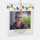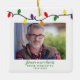 Ornements carrés de photo de vacances de Noël moderne et rustique pour toujours dans nos cœurs avec une petite chaîne adorable de lumières de Noël colorées en rouge, vert, jaune et violet, ainsi qu'une typographie moderne. Ajoutez 2 de vos photos préférées pour l'ornement de souvenir de mémoire parfait ! Veuillez nous contacter à cedarandstring@gmail.com si vous avez besoin d'aide pour la conception ou les produits correspondants.