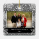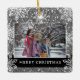 Festive Merry Christmas photo ornament with a cute snowflakes pattern frame on silver glitter background. Personalize with family name and year.