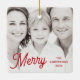 Christmas photo ornament featuring your custom family photo and red text “Merry” in a festive, retro style font with customizable name and year to the right. Double sided printing with space for two photos.