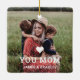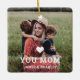 Cute Heart Love You Mom Mother's Day Photo Christmas Ornament présente votre photo préférée avec le texte "(love heart) you Mom" en script blanc moderne avec vos noms ci-dessous. Personnalisez en modifiant le texte dans la zone de texte fournie et en ajoutant votre propre image. Conçu par ©Evco Studio www.zazzle.com/store/evcostudio