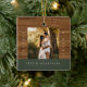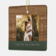 Celebrate your engagement with this elegant mid-century modern ornament, featuring a stylish faux brown wood and white two-tone design. A bold dark olive green stripe along the bottom highlights the couple’s name, while a minimalist square frame displays your favorite engagement photo. With one photo on each side, this ornament is a beautiful double-sided keepsake. The phrase “Engaged & Merry”, the year, and your names are displayed in a clean, modern font around the image – perfect for adding a personal touch to your holiday decor or gifting to a newly engaged couple. Design and Layout by ©Moodthology Papery