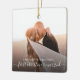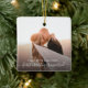 Celebrate your first holiday season as newlyweds with this modern wedding photo ornament. Your names appear in elegant sans serif above the phrase first Christmas married, written in flowing script across the bottom of the image. The warm, romantic photo background pairs beautifully with the soft, modern typography for a keepsake that feels both timeless and personal.