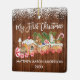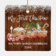 Script moderne de brosse Mon premier ornement de Noël comprend Watercolor Gingerbread Train avec bonbons, biscuits et pins. Bois rustique avec neige.