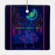 Cet ornement tropical d'arbres de Noël de plage dispose de deux Flamants roses de néon rose en Amour sous une lune de néon. Elles sont entourées de palmiers ornés de lampadaires verts au néon. Le dos peut être personnalisé avec les noms, une année ou tout texte que vous souhaitez ajouter. -