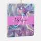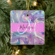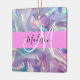 Nom monogramme irisé holographique rose, violet et aqua et ornement céramique initial. Votre nom personnalisé et votre monogramme sont écrits dans un élégant script écrit à la main avec un arrière - plan rose. Un cadeau d'anniversaire ou de Noël parfait !