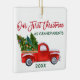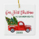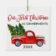 Moderne pinceau script Notre premier Noël en tant que grands-parents ornement comprend aquarelle vintage camion rouge avec arbres de Noël, lumières, neige et cadeaux de Noël. Écriture rouge.