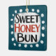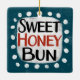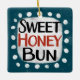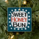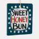 Un joli design typographique qui dit "Sweet Honey Bun". C'est du texte en noir et rouge sur un rectangle blanc avec des points blancs amusants autour, le tout sur un arrière - plan turquoise.