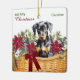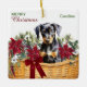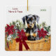 Voici un joli ornement de Fêtes qui ferait un grand cadeau pour un petit-enfant, un fils, une fille ou n'importe qui. Les deux côtés de l'ornement ont l'image d'un panier de fleurs de poinsettia rouges, de fleurs blanches et de branches de pinède. Au milieu se trouve un adorable chiot Doberman Pinscher. Le panier en osier est décoré d'un arc rouge. Sur le devant, un texte vert et rouge dit "Joyeux Noël, et un nom. Le dos a votre signature et l'année.
