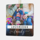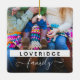 Custom Christmas Ceramic Ornament personalized with your photo and family surname. Your custom name is written in an uppercase black font with a white background, and the word "family" is written in an elegant hand lettered font script with curly swashes. Click "Personalize" to add your family name monogram and a large photo of your family. Click "Click to customize further" to change the font and text color. A custom Christmas Ceramic Ornament makes a great gift for family and friends!