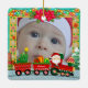 Capture a treasured moment with this adorable photo Christmas ornament! Featuring a charming North Pole Express train carrying Santa, gifts, and a festive Christmas tree, this design provides a perfect, colorful frame for your favorite baby, child, or family photo.