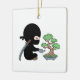Adorable petit ninja habillé en noir est assis à pattes croisées près d'un planteur et arrosant un petit bonsaï. L'épée katana japonaise est attachée sur le dos.