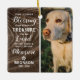 Ornement de photo de Noël mémorial pour animal de compagnie avec un fond à effet bois rustique, une photo de votre animal bien-aimé, une citation de condoléances qui dit "votre vie était une bénédiction, votre souvenir est un trésor, vous êtes aimé au-delà des mots et manqué au-delà de toute mesure", une empreinte de patte avec un cœur d'amour, le nom de votre chien ou chat, et leurs dates de naissance et de décès.
