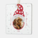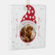Photo à double face d'un animal de compagnie aimant dans un chapeau d'elfe aux pattes de chien rouges et blanches entouré de flocons de neige et des mots Pour toujours dans nos cœurs. Personnalisez facilement avec la photo, le nom et l'année du mémorial de votre animal. Le cadeau idéal pour cette saison des fêtes et l'arbre de Noël.