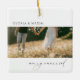 Un ornement moderne de Noël marié avec un design noir et blanc simple et minimal avec "joyeux + mariés" dans une élégante typographie avec un nom dans une police serif classique et traditionnelle. L'avant a une photo de paysage et l'arrière a une deuxième photo de carré.