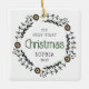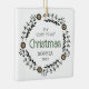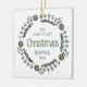 Célébrez le premier Noël du bébé avec cet ornement de conservation, avec une couronne d'art populaire de style scandinave de verdure et de fleurs griffées. Le mot "Noël" apparaît en vert. Personnalisez l'ornement avec le nom du bébé et l'année en noir sans serif police sur un côté et votre photo préférée sur l'autre.