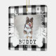 Ferme rustique arbres de Noël frais animal photo gardien de l'ornement. L'ornement peut être customisé avec le nom de l'animal, l'année, et la photo. Arrière - plan en damier noir avec pins rustiques et flocons de neige. Le nom de l'animal est affiché sur un os de chien blanc. Oeuvre de Moodthology Papery.