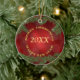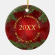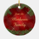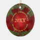 Voici un ornement de Noël personnalisé et festif qui fait un bon souvenir de famille. L'avant a une bordure supérieure et inférieure d'aiguilles de pin vert et de cônes de pin. Le texte du cercle d'or dit Joyeux Noël en haut, et Joyeux Nouvel An en bas. Votre texte personnalisé est en or au milieu. Les images et le texte sont placés sur un arrière - plan rouge dégradé avec un motif cercle abstrait subtil. Le dos de l'ornement a la même image de bordure et arrière - plan, avec votre texte personnalisé pour le personnaliser. Joli ! *Veuillez noter que l'image est imprimée et ne contient pas de parties scintillant réelle.*