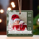 Nouveau bébé statistiques de naissance photo ornement de Noël. Le design comprend deux photos, une photo à l'avant et une à l'arrière. Affichez la photo de votre nouveau bébé. La date de naissance est affichée le long du côté et le nom et la naissance du bébé se trouvent le long du bas. Un arrière - plan vert avec des flocons de neige blancs, des pins et des cerfs est ajouté au bas de la photo. **Veuillez noter que vous pouvez modifier la couleur de l'arrière - plan en cliquant sur modifier à l'aide de l'outil de conception. L'envers dispose d'un endroit pour ajouter une deuxième photo. Des flocons de neige blancs, des arbres et des cerfs sont ajoutés. design par Moodthology Papery