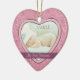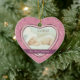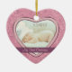 Cette ornementation de vacances en saké présente votre propre photo de bébé encadrée dans un joli cadre de coeur rose et bordée d'argent. Le cadre du coeur est bordé d'une motif rose rose tourbée. Une bannière violette de prune plus foncée tient votre texte customisé; faites-le dire ce que vous voulez! L'arrière de l'ornement a la même bordure motif tourbée rose et le cadre en forme de coeur avec du texte supplémentaire sur la prune à l'intérieur. Cela fait un beau cadeau de conservation pour les nouveaux parents.