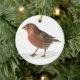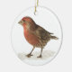 Cet ornement de vacances comporte un pinson de maison masculin se tenant dans la neige. Il a beau a le plumage rouge sur sa tête et sein. La neige s'accroche à son bec. Ne semblera-t-il pas beau pendre de votre arbre de Noël ?