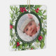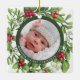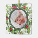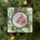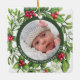 Décorez votre arbre ou offrez un cadeau spécial cette saison de vacances avec cette photo élégante dans un ornement design de couronne de noël, et décoration assortie. Cet ornement de Noël de chien présente une couronne verte et rouge d'aquarelle avec des saints et des baies. Personnalisez avec nom et année. Ce premier ornement de noël est parfait pour bébé, animaux de compagnie, chien, grands-parents et jeunes mariés. Visitez notre collection pour obtenir des cartes de noël, des décors et des cadeaux assortis. DROIT D'AUTEUR © 2020 Judy Burrows, Black Dog Art - Tous droits réservés. Premier Noël Mistletoe Wreath Custom Baby Photo Ornament en céramique