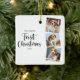 Mon premier Noël ! Décorez votre arbre ou envoyez un cadeau spécial avec ce super mignon personnalisé marionnette photo de vacances de chiot dans un design moderne et simple. Ajoutez vos 3 photos de chiens préférées et personnalisez avec le nom et l'année. L'ornement est double face, double conception des deux côtés. DROIT D'AUTEUR © 2020 Judy Burrows, Black Dog Art - Tous droits réservés. Premier Noël Moderne Simple Animaux de compagnie Chien Chien Photo Céramique Ornement