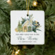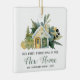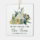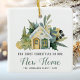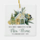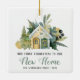 Célébrez votre premier Noël dans votre nouvelle maison avec ce joli ornement de gardiens, avec un tableau aquarelle d'un cottage jaune et vert confortable entouré de feuillage et de baies d'hiver. Le texte dit "Notre premier Noël dans notre nouvelle maison", avec les mots "Nouvelle maison" en calligraphie verte et le texte restant en gris charbon. Personnalisez-le avec le nom de votre famille et l'année.