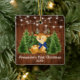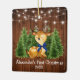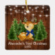 Première Noël de bébé Ornement aquarelle Animaux de la forêt Cerf Arbres de pin. Comprend un jeune cerf avec un nœud bleu sur une végétation forestière et des guirlandes lumineuses. Bois rustique de campagne. Ajoutez un nom.