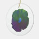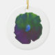Ce joli ornement de style pendentif présente une photo d'une fleur de pétunia manipulée pour rendre le centre de la fleur bleu. Le reste de la fleur a des teintes violettes, vertes et bleues, ce qui lui donne l'apparence d'une fleur arc-en-ciel grungy. Il y a du texte vert personnalisable à l'arrière de l'ornement pour que vous puissiez le personnaliser.