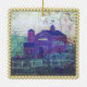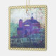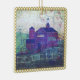 Grande grange de foin rouge avec silo et girouette météo, clôture blanche pour piquets et tournesols le long de la clôture. Bordure de motif de damier or et blanc. Style vintage ferme.